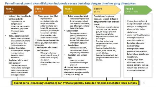 Pada halaman terakhir, ada lima fase pemulihan ekonomi yang berisi skenario bisnis dan industri beroperasi secara bertahap. Selain itu, sektor itu juga mencakup pendidikan hingga kegiatan ibadah dan budaya.