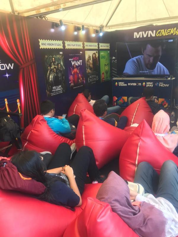 Para pengunjung tampak antusias mengikuti serangkaian acara di booth MVN Cinema sambil menikmati free super WiFi dari MNC Play, free charging station, serta snack gratis di area MVN Cinema.