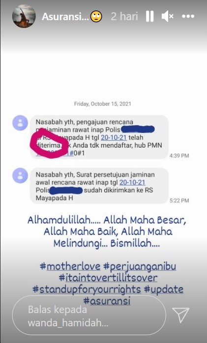 “Alhamdulillah..... Allah Maha Besar, Allah Maha Baik, Allah Maha Melindungi... Bismillah...” demikian unggahan Instastory akun @wanda_hamidah, yang juga menampilkan screen shoot potongan pesan dari pihak perusahaan asuransi.