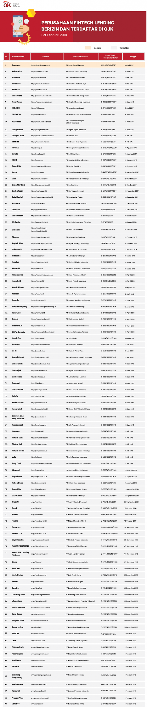 OJK meminta masyarakat untuk memeriksa legalitas perusahaan fintech pendanaan sebelum mengajukan pinjaman. Hingga Februari 2019, ada 99 fintech yang terdaftar di OJK. Berikut daftarnya: