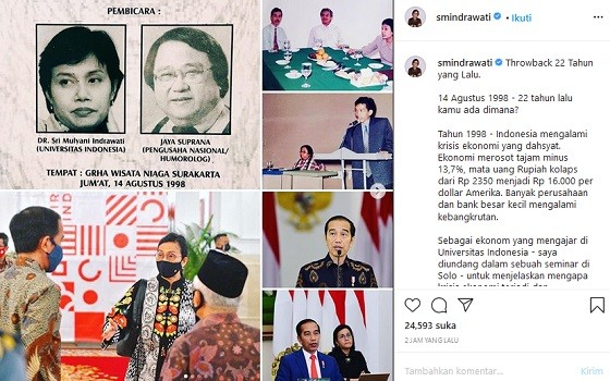 “Pak Jokowi menggunakan windfall profit secara bijaksana dengan menambah kapasitas produksi, berhasil memanfaatkan situasi krisis justru untuk mengembangkan usahanya. 22 tahun kemudian Pak Jokowi adalah Presiden Republik Indonesia, dan saya diminta beliau menjadi menteri keuangan,” tulisnya.