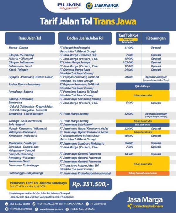 Berikut perhitungan tarif tol yang menghubungkan Jakarta-Surabaya berdasarkan data tarif per akhir April 2018. Untuk ruas tol dari Jakarta hingga Surabaya, uang yang harus dikeluarkan sebesar Rp351.500. Tarif tersebut dihitung mulai dari Jalan Tol Jakarta-Cikampek hingga Jalan Tol Surabaya-Gempol dan Kejapanan-Gempol.