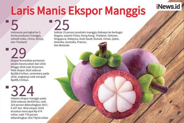 Melansir data Badan Pusat Statistik (BPS), volume ekspor manggis pada 2018 sebesar 38.830 ton, tumbuh signifikan 324 persen dibandingkan 2017, yang hanya 9.167 ton. Nilai ekspor 2018 tersebut mencapai Rp474 miliar, naik 778 persen dibandingkan 2017 Rp54 miliar.