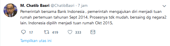 "Pemerintah bersama Bank Indonesia, pemerintah mengajukan diri menjadi tuan rumah pertemuan tahunan September 2014. Prosesnya tidak mudah, bersaing dengan negara-negara lain. Indonesia dipilih menjadi tuan rumah Oktober 2015," kata Chatib, dikutip dari akun Twitter-nya @ChatibBasri, Minggu (7/10/2018).