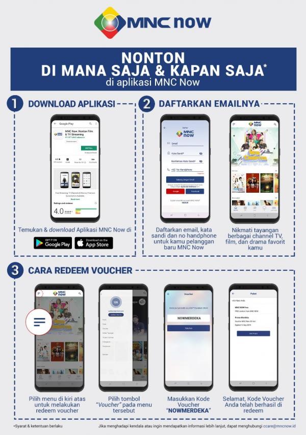Dengan me-redeem voucher Promo Merdeka, maka pelanggan dapat menikmati lebih dari 60 channel lokal, internasional, dan premium serta 10.000+ jam film dan serial TV Indonesia dan Mancanegara secara gratis. Periode redeem voucher Promo Merdeka MNC Now berlaku mulai dari 16 Agustus sampai dengan 31 Agustus 2019.