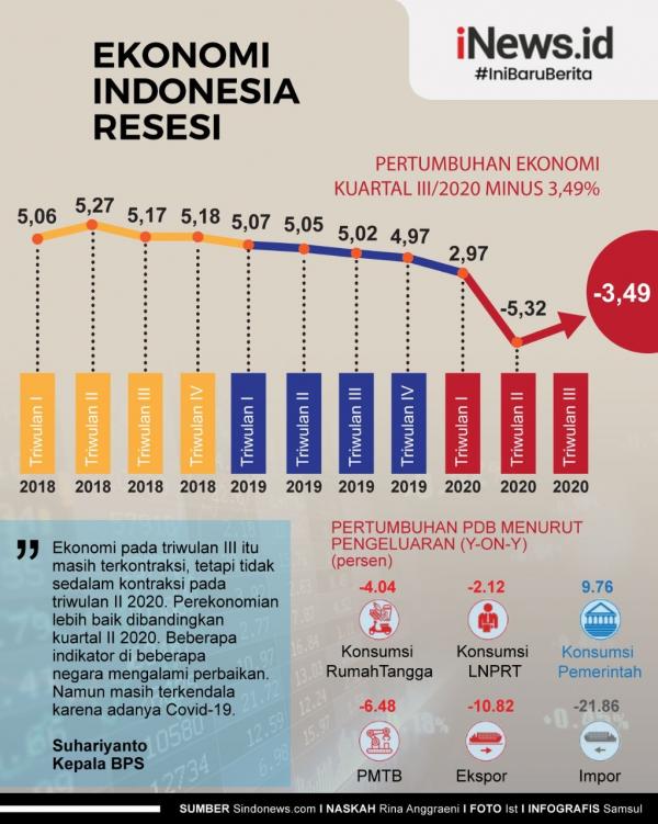 JAKARTA, iNews.id - Ekonomi Indonesia pada triwulan III 2020 kontraksi minus 3,49 persen. Pencapaian ini menjadikan Indonesia masuk jurang resesi.