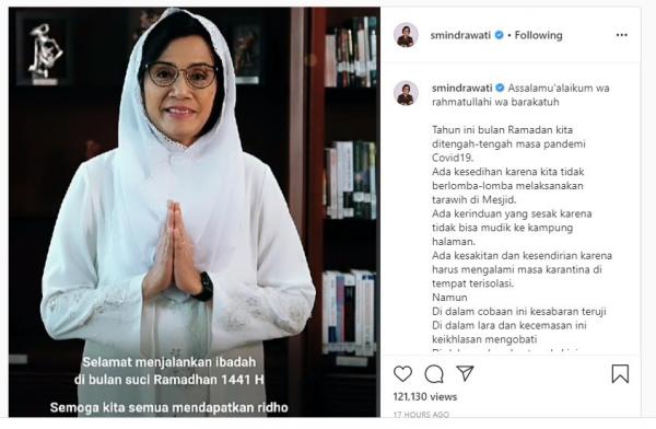 "Ada kesedihan karena tidak berlomba-lomba melaksanakan tarawih di Masjid, Ada kerinduan yang sesak karena tidak bisa mudik ke kampung halaman. Ada kesakitan dan kesendirian karena harus mengalami masa karantina di tempat terisolasi," tulis Menteri Keuangan, Sri Mulyani Indrawati lewat akun instagram @smindrawati, Sabtu (25/4/2020).