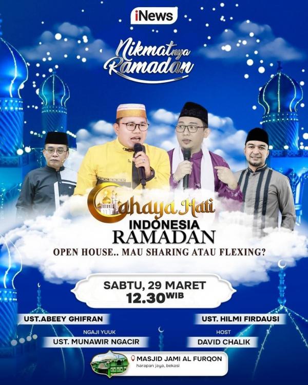 iNews TV Religi Detail Berita Cahaya Hati Indonesia Siang Ini: Open House Mau Sharing atau Flexing? Pukul 12.30 WIB Hanya di iNews Sabtu, 29 Maret 2025 - 11:50:00 WIB Share copy link article Link Copied! Karina Asta Widara Ustadz Abeey Ghifran dan Ustadz Hilmi Firadausi akan membahas tentang bagaimana Islam memandang “Open House Mau Sharing atau Flexing? (Foto: iNews)