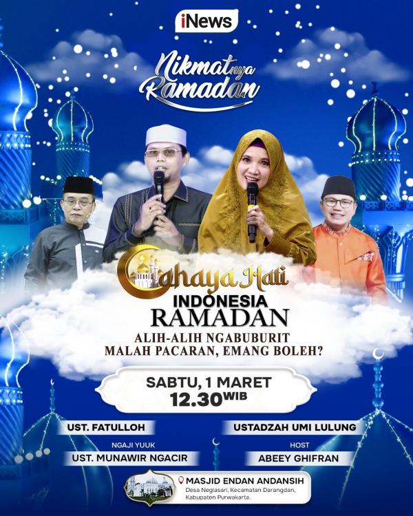 JAKARTA, iNews.id - Program inspiratif Cahaya Hati Indonesia kembali hadir di iNews pekan ini dengan tema spesial yang penuh makna “Alih-Alih Ngabuburit, malah pacaran, emang boleh?”. Ramadan adalah bulan penuh berkah yang seharusnya dimanfaatkan untuk memperbanyak ibadah dan meningkatkan ketakwaan kepada Allah SWT.