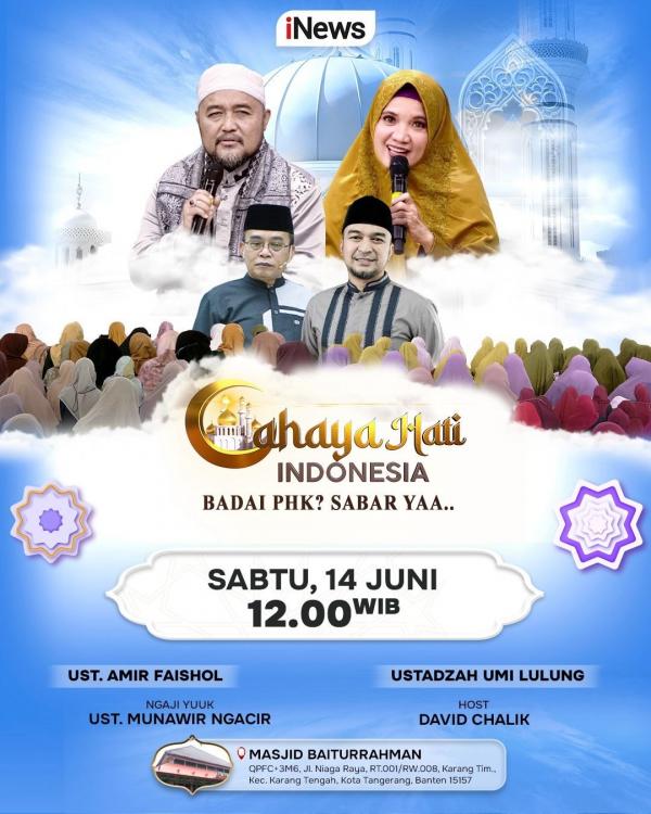 iNews TV Religi Detail Berita Jangan Lewatkan Cahaya Hati Indonesia: Badai PHK? Sabar Yaa, Pukul 12.00 WIB di iNews Sabtu, 14 Juni 2025 - 08:11:00 WIB Share copy link article Link Copied! Karina Asta Widara Cahaya Hati Indonesia mengangkat tema yang sangat relevan dengan kondisi saat ini di masyarakat “BADAI PHK? SABAR YAA. (Foto: iNews)