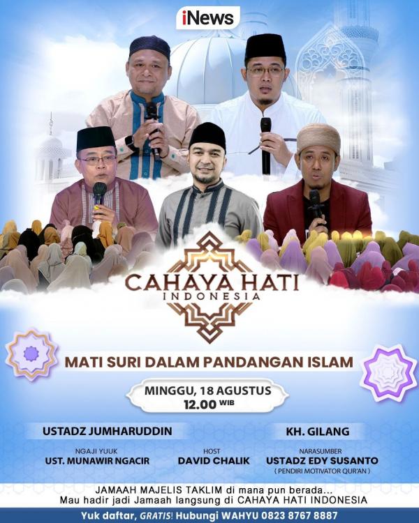 Saksikan “Cahaya Hati Indonesia”, setiap Sabtu dan Minggu pukul 12.00 WIB, hanya di iNews. Bagi Jemaah majelis taklim dimanapun berada. Mau hadir jadi jamaah langsung di program Cahaya Hati Indonesia? Yuk, daftar gratis hubungi Wahyu di nomor 0823-8767-8887.