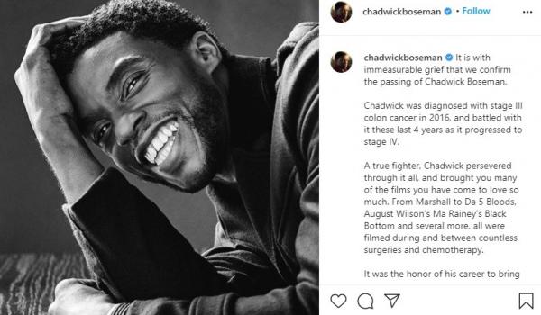"Chadwick didiagnosis menderita kanker usus besar stadium III pada tahun 2016, dan berjuang melawannya selama empat tahun terakhir ini saat berkembang ke stadium IV," tulis keterangan keluarganya tersebut.