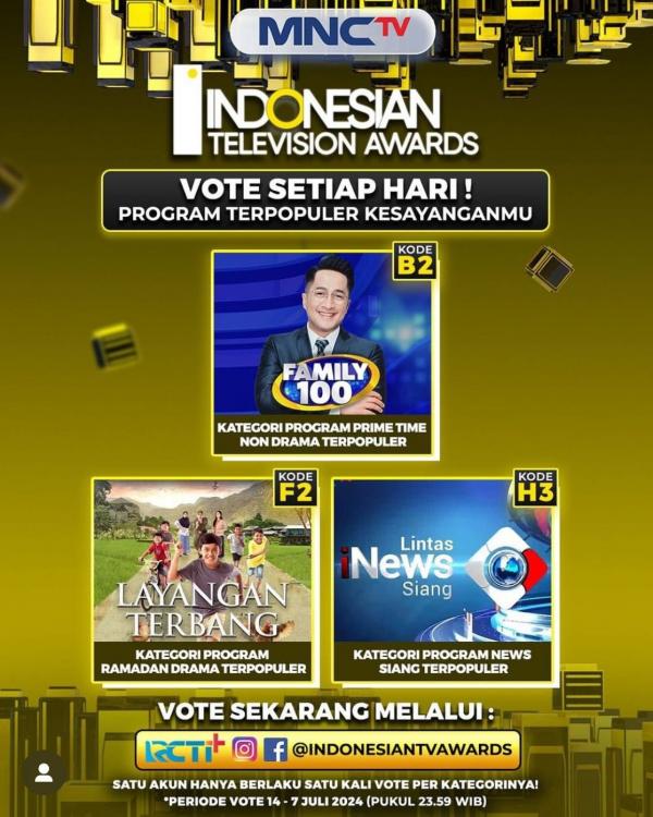 Ayo dukung program-program MNCTV di ajang Indonesian Television Awrads 2024, vote sekarang melalui aplikasi RCTI+, serta platform sosial media Instagram dan Facebook @Indonesiantvawards.