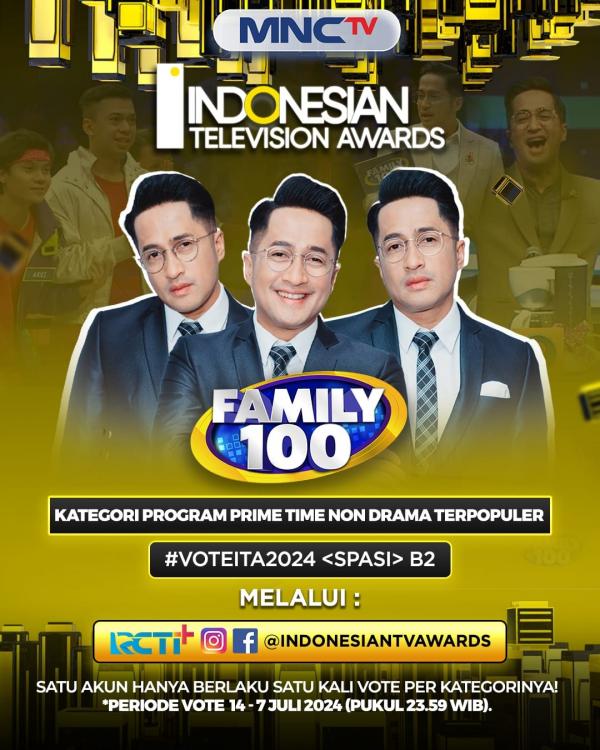 Lifestyle Film Detail Berita Dukung dan Vote Program MNCTV Family 100 di Indonesian Television Awards 2024 Minggu, 23 Juni 2024 - 16:32:00 WIB Share copy link article Link Copied! Dani M Dahwilani Game Family 100 kali masuk nominasi Kategori Program Prime Time Non Drama Terpopuler di ajang penghargaan Indonesian Television Awards 2024. (Foto: MNCTV)