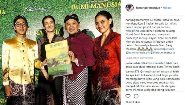 Pro dan kontra tersebut ramai berseliweran di media sosial, salah satu yang jadi serbuan adalah akun Instagram Hanung Bramantyo saat mengunggah foto bersama tiga pemeran film Bumi Manusia.