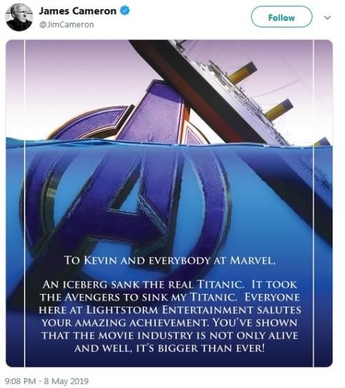 Sutradara Titanic, James Cameron memberikan ucapan selamat kepada Marvel dan Kevin Faige selaku produser atas keberhasilan Avengers: Endgame. Dalam akun twitternya, dia menuliskan bahwa pencapaian Endgame sukses menenggelamkan Titanic.
