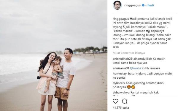 "Hasil pertama kali si anak kecil ini nonton film bapaknya 'Koki-koki Cilik yang nanti tayang 5 Juli, komennya "kakak masak", "kakak makan". Komen tentang bapaknya jarang," kata Ringgo melalui keterangan foto yang diunggah di Instagram miliknya, Jumat (29/6/2018).
