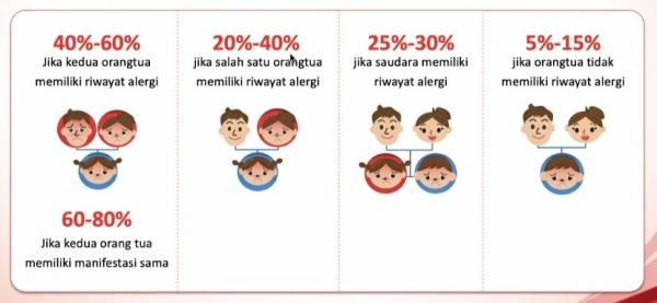 Sebagai catatan, ada beberapa faktor yang dapat meningkatkan risiko anak mengalami alergi. Pertama riwayat alergi pada keluarga. Jika di keluarga ada yang mengalami alergi, ibu, ayah atau kedua-duanya, risiko anak mengalami alergi sangat besar. Berikutnya, kelahiran anak secara caesar, serta asap rokok dan polusi udara.