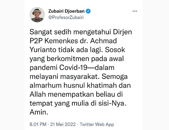 "Sangat sedih mengetahui Dirjen P2P Kemenkes dr. Achmad Yurianto tidak ada lagi. Sosok yang berkomitmen pada awal pandemi Covid-19 dalam melayani masyarakat. Semoga almarhum husnul khatimah dan Allah menempatkan beliau di tempat yang mulia di sisi-Nya. Amin," ujar Prof Zubairi, dikutip dari akun Twitter pribadinya, Sabtu (21/5/2022).
