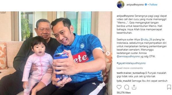“Senangnya pagi-pagi dapat video call dari cucu yang mulai memanggil “Memo...”. Gaia mengangkat tangan berdoa untuk kesembuhan Memo. Hati bahagia, insya Allah bisa mempercepat kesembuhan,” tulis Ani.