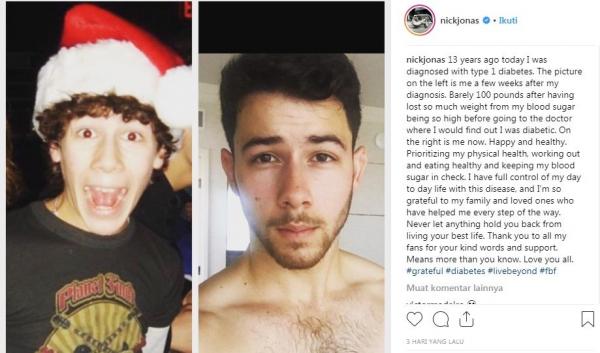 Seperti dikutip dari akun Instagram pribadinya, Nick mengungkap rasa syukur masih bisa hidup hingga sampai sekarang. Penyanyi asal Amerika Serikat ini menuliskan bahwa sejak 13 tahun lalu dia didiagnosis menderita diabetes tipe 1 yang bisa menghilangkan nyawanya.