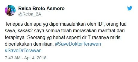 "Terlepas dari apa yang dipermasalahkan IDI, orangtua saya, kakak-kakak saya semua telah merasakan manfaat dari terapinya. Seorang yang hebat seperti dr T rasanya miris diperlakukan demikian #SaveDokterTerawan #SavedrTerawan," kata Reisa Broto Asmoro dikutip iNews.id dari akun Twitter-nya, Rabu (4/4/2018).