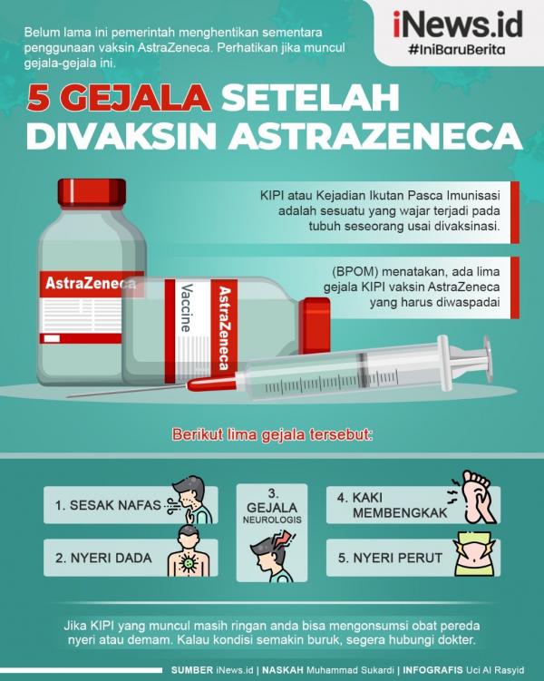 "Masyarakat yang mendapatkan vaksin Covid-19 AstraZeneca diminta untuk segera menghubungi dokter atau saranan pelayanan kesehatan terdekat atau tempat vaksinasi apabila mengalami 5 gejala tersebut," tulis laporan BPOM terbaru, dilansir Rabu (19/5/2021).