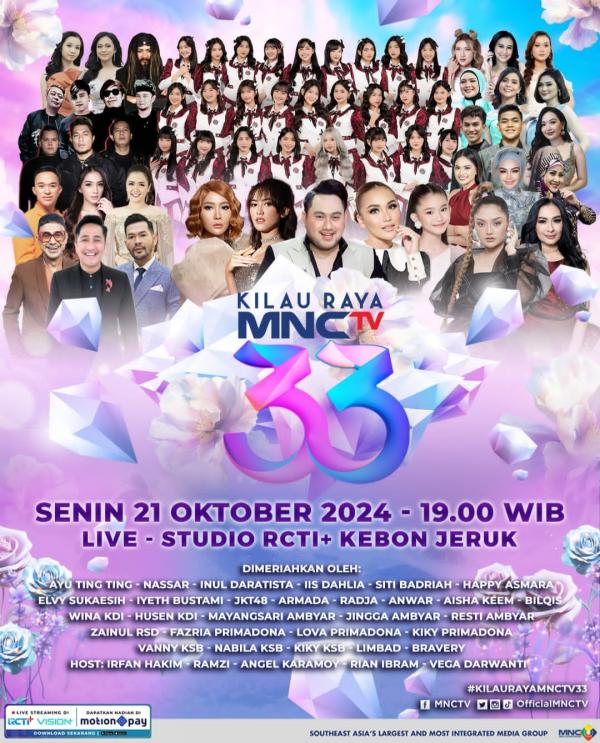 Jangan lewatkan kemeriahan hari ulang tahun ke-33 MNCTV, konser Kilau Raya MNCTV K33setiaan pada Senin, 21 Oktober 2024, pukul 19.00 WIB hanya di MNCTV Selalu di Hati.