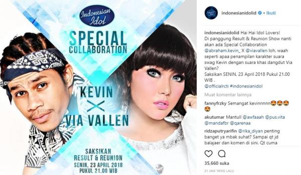 Kevin dipasangkan dengan Via Vallen memang bukan tanpa alasan. Di babak Top 11 Indonesian Idol, Kevin mendapatkan tantangan khusus menaklukkan lagu hits Sayang dari Via Vallen. Alhasil, penampilan Kevin sukses memukau penonton, termasuk para juri. Mereka adalah Armand Maulana, Maia Estianty, Bunga Citra Lestari, Judika, dan Ari Lasso. Dan kolaborasi Kevin dan Via Vallen di panggung Result & Reunion Show nanti, juga menarik rasa penasaran para netizen. Mereka tidak sabar menunggu aksi panggung idolanya.“Sangat ku nantikan dan jangan sampai terlewatkan, performance @abraham.kevin,” kata @agung_736.”Aku mah.. Terserah siapa saja yg manggung. Yg penting sang idola juara,” ujar @ edynasilitonga.“Mungkin,... @indonesianidolid pingin apresiasi seorang @viavallen bhw utk menjadi Dangdut Idol spt sekarang tidaklah instan, bener2 merangkak dari bawah, So, kita nikmatin aja guys,” kata @hen_driy.Buat kalian yang kangen Kevin saat menyanyikan lagu Sayang dari Via Vallen, berikut videonya: