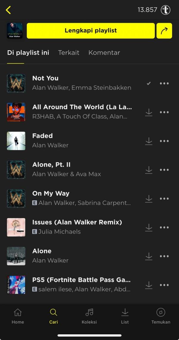 Lagu-lagu Alan Walker di aplikasi TREBEL Musik yang siap didownload gratis dan didengarkan secara tanpa internet