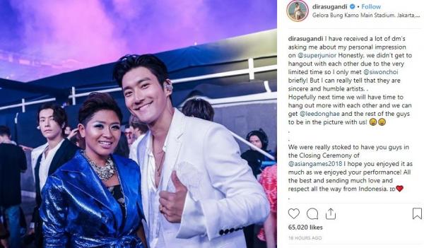 "Donghae sama Siwon khusus nyamperin gue untuk bilang mereka suka banget lagu 'Unbeatable' dan penampilan gue, di saat itulah gue yakin banget kalau mereka sangat humble," tulis Dira Sugandi melalui keterangan foto di Instagram miliknya, Selasa (4/9/2018).