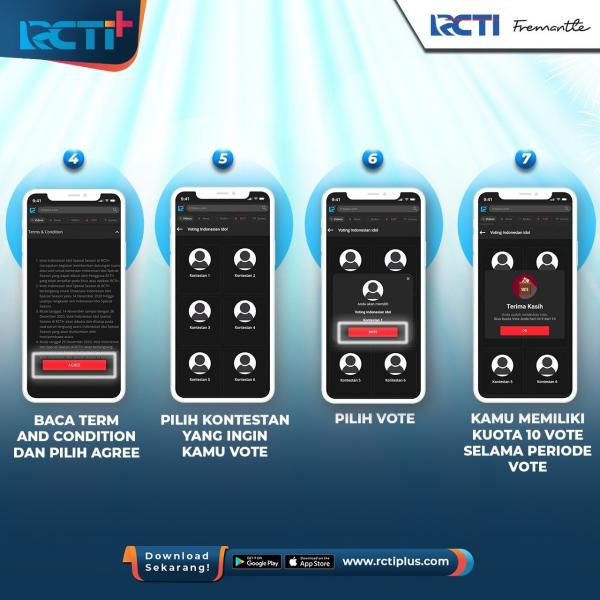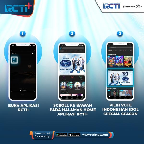 Scroll ke bawah pada halaman home aplikasi RCTI+, lalu pilih vote Indonesian Idol Special Season. Setelah itu kamu baca term and condition dan pilih agree jika setuju. Kemudian kamu dapat memilih kontestan yang ingin kamu vote dan pilih klik vote. Selama periode vote berlangsung, kamu memiliki kuota sebanyak 10 kali vote.