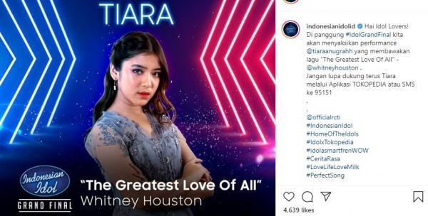 “Hai Idol Lovers! Di panggung #IdolGrandFinal kita akan menyaksikan performance @tiaraanugrahh yang membawakan lagu "The Greatest Love Of All" - @whitneyhouston,” tulis akun Instagram Indonesian Idol.