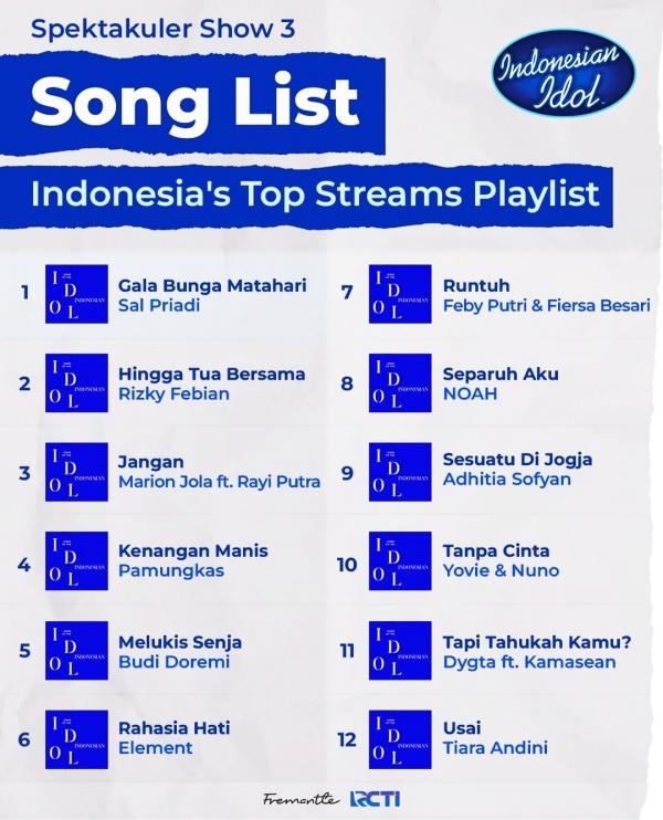 Berikut deretan lagu dari musisi lokal yang akan dibawakan kontestan Top 12 di babak spekatkuler show Indonesia Idol XIII: