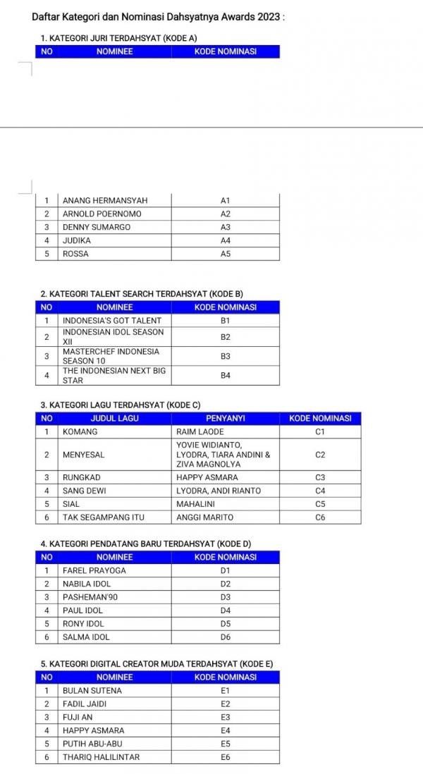 4. Vote dengan cara comment di posting-an kategori yang ada dengan format: #VOTEDAHSYATNYAAWARDS2023 <spasi> kode nominasi