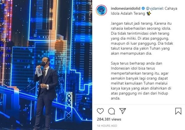 “Saya terus berharap anda dan Indonesian Idol bisa terus mempertahankan terang itu, agar semakin banyak lagi orang dapat melihat kemuliaan Tuhan melalui karya karya yang akan dilahirkan di atas panggung ini dan dari hidup anda. Terima kasih Indonesia. Daniel Mananta Pamit,” tulisnya lagi.