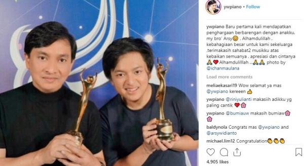 "Baru pertama kali mendapatkan penghargaan berbarengan dengan anakku, my bro Arsy. Alhamdulillah, kebahagiaan besar untuk kami sekeluarga," tulis Yovie, seperti dikutip iNews.id dari keterangan foto Instagram miliknya, Kamis (27/9/2018).