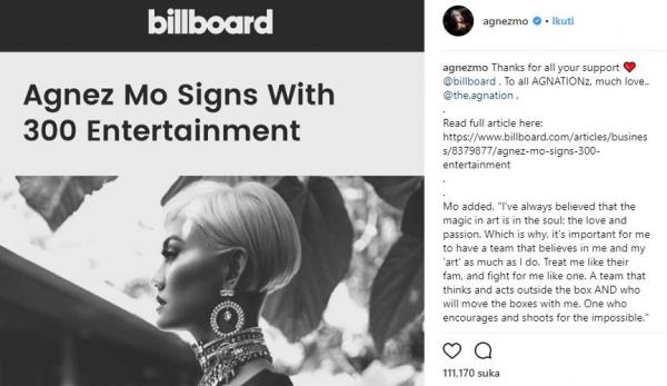 Lewat akun Instagram-nya, Agnez mengumumkan pencapaian internasional terbarunya itu. Sembari mengunggah potongan berita dari Billboard tentang bergabungnya dia di bawah 300 Entertainment, Agnez sekaligus berterima kasih kepada pihak-pihak yang telah mendukungnya.