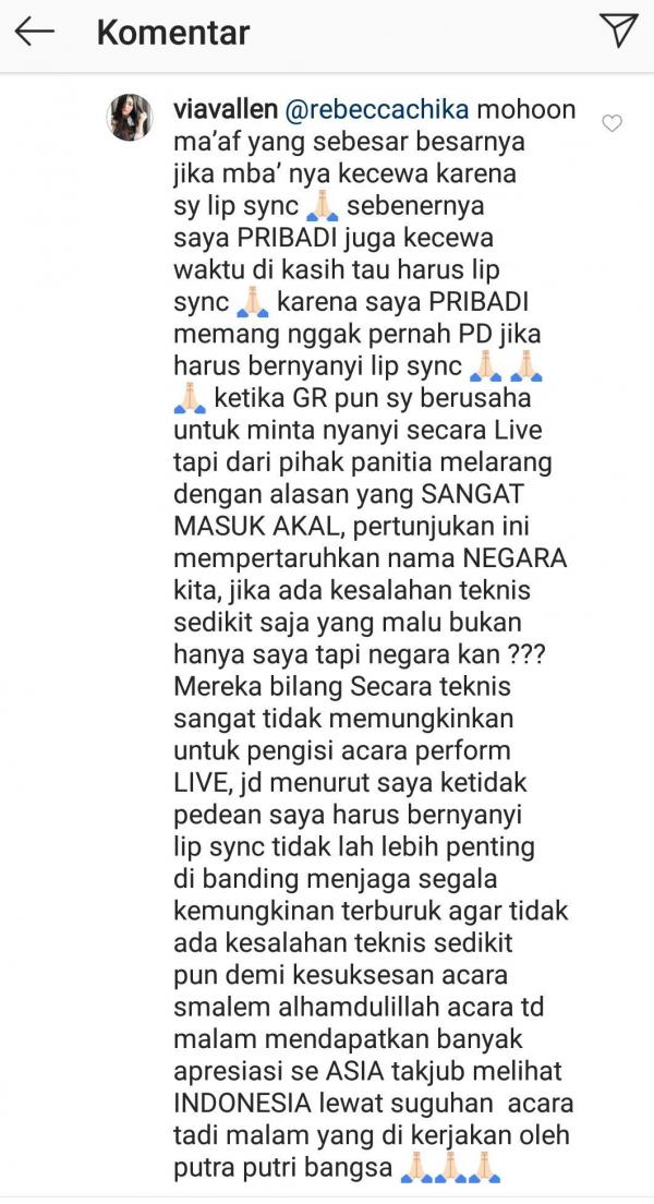 "Mohon maaf sebesar-besarnya jika mbaknya kecewa karena saya lipsync. Sebenarnya saya pribadi juga kecewa waktu dikasih tahu harus lipsync. Tapi dari pihak panitia melarang dengan alasan yang sangat masuk akal, pertunjukan ini mempertaruhkan nama negara kita, jika ada kesalahan teknis sedikit saja yang malu bukan hanya saya tapi negara kan?" ujar Via Vallen seperti dikutip iNews.id dari kolom komentar, Senin (20/8/2018).