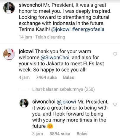 "Terima kasih atas sambutan hangatnya dan juga tentang kunjungannya ke Jakarta untuk bertemu para ELF beberapa waktu lalu. Sangat gembira bertemu kalian semua," tulis Presiden Jokowi membalas dengan bahasa Inggris.