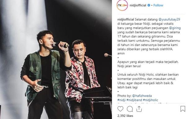 "Selamat datang @yusufubay29 di keluarga besar Nidji, sebagai vokalis baru yang melanjutkan perjuangan @giring yang sudah berkarya bersama kami selama 17 tahun," demikian dikutip dari akun Instagram resmi Nidji (@nidjiofficial), Senin (4/2/2019).