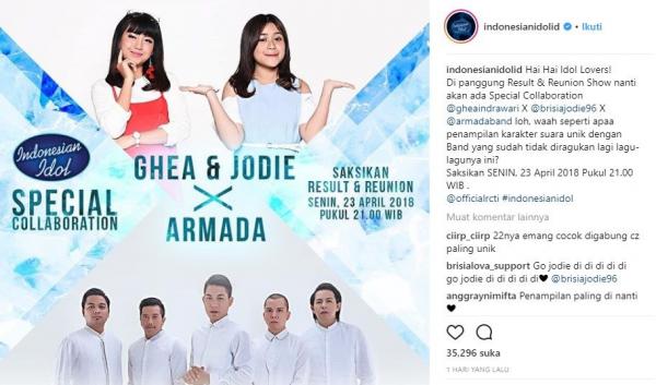 "Hai Hai Idol Lovers! Di panggung Result & Reunion Show nanti akan ada Special Collaboration @gheaindrawari X @brisiajodie96 X @armadaband loh," tulis akun Instagram resmi Indonesian Idol (@indonesianidolid).