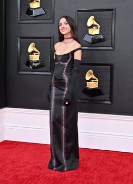 Olivia Rodrigo akhirnya tampil mencuri perhatian di ajang besar. Di Grammy Awards 2022 ini, Olivia mengenakan sleek black bodycon dress dengan gaya off-the-shoulder neckline yang dipadukan dengan elbow-length black gloves.