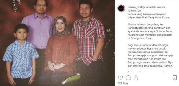 "Innalilahi wainna ilahiroji'un. Semua yang bernyawa hanyalah titipan dari Allah Yang Maha Kuasa. Malam ini telah berpulang ke Rahmatullah seorang pahlawan dan ayahanda tercinta saya, Sutopo Purwo Nugroho saat menjalani pengobatan di Guangzhou, Cina," tulis Ivanka.