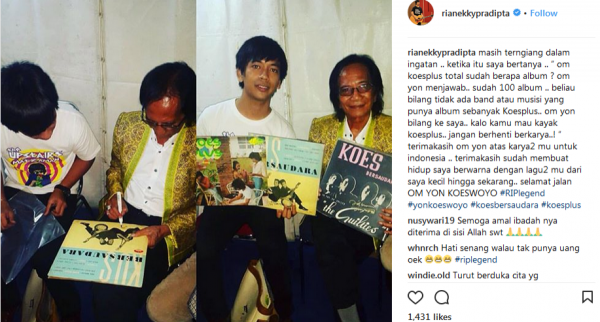 "Masih terngiang dalam ingatan ketika itu saya bertanya, "om koesplus total sudah berapa album? Om Yon menjawab, sudah 100 album. Beliau bilang tidak ada band atau musisi yang punya album sebanyak Koesplus," kenang dia melalui keterangan foto yang diunggah di Instagram.