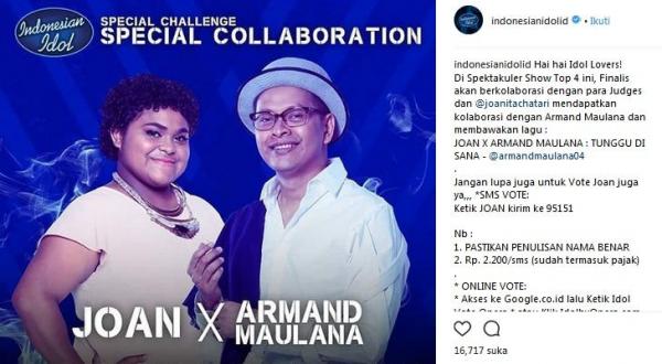 ”Hai hai Idol Lovers! Di Spektakuler Show Top 4 ini, Finalis akan berkolaborasi dengan para Judges dan @joanitachatari mendapatkan kolaborasi dengan Armand Maulana dan membawakan lagu: JOAN X ARMAND MAULANA : TUNGGU DI SANA - @armandmaulana04,” tulis @indonesianidolid.