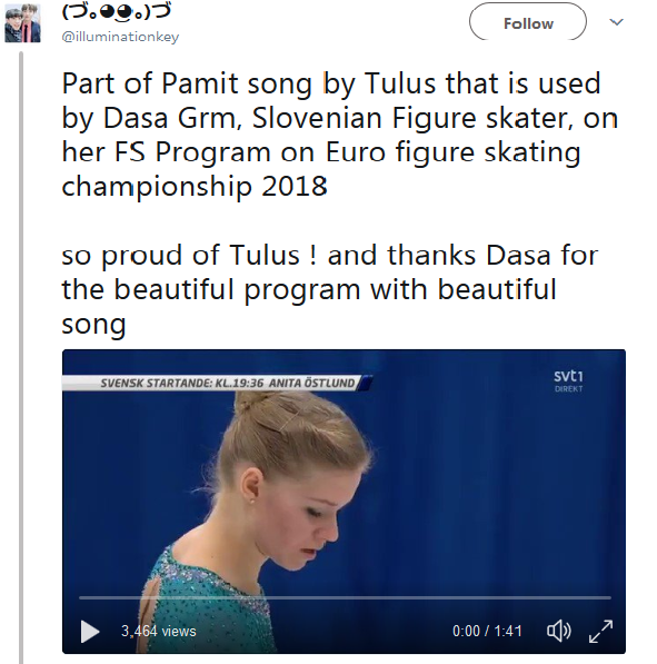 “Mas Tulus Kehormatan banget buat saya fans Tulus dan figure skating lagunya dipakai untuk free skating program atlet dari Slovenia. Salut,” kicaunya di Twitter.