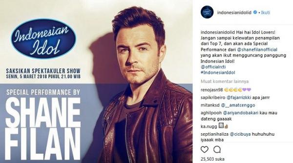 "Hai hai Idol Lovers! Jangan sampai kelewatan penampilan dari Top 7, dan akan ada Special Performance dari @shanefilanofficial yang akan ikut mengguncang panggung Indonesian Idol! @officialrcti #IndonesianIdol," tulis akun Instagram Indonesian Idol, seperti dikutip iNews.id, Minggu 4 Maret 2018.