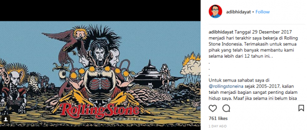 “Tanggal 29 Desember 2017 menjadi hari terakhir saya bekerja di Rolling Stone Indonesia. Terimakasih untuk semua pihak yang telah banyak membantu kami selama lebih dari 12 tahun ini,” tulis Adib melalui akun Instagram pribadinya baru-baru ini.