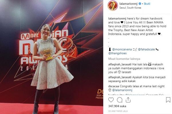 Lala meluapkan rasa gembiranya di akun Instagramnya, terlihat dia bahagia memegang penghargaan yang diraihnya. Baginya ini adalah upah dari kerja keras yang dilakukan.